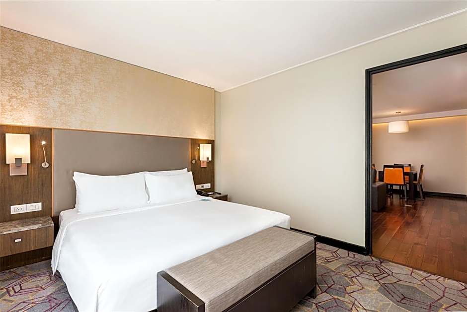 This spacious suite consists of a kitchenette, a seating area, 1 separate bedroom and 1 bathroom with a walk-in shower and a bath. The suite's kitchenette, which features a refrigerator and a microwave, is available for cooking and storing food. The air-conditioned suite provides a flat-screen TV with cable channels, soundproof walls, a mini-bar, a tea and coffee maker as well as city views. The unit offers 1 bed.